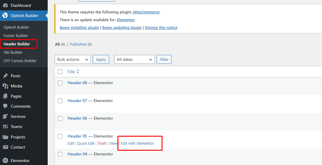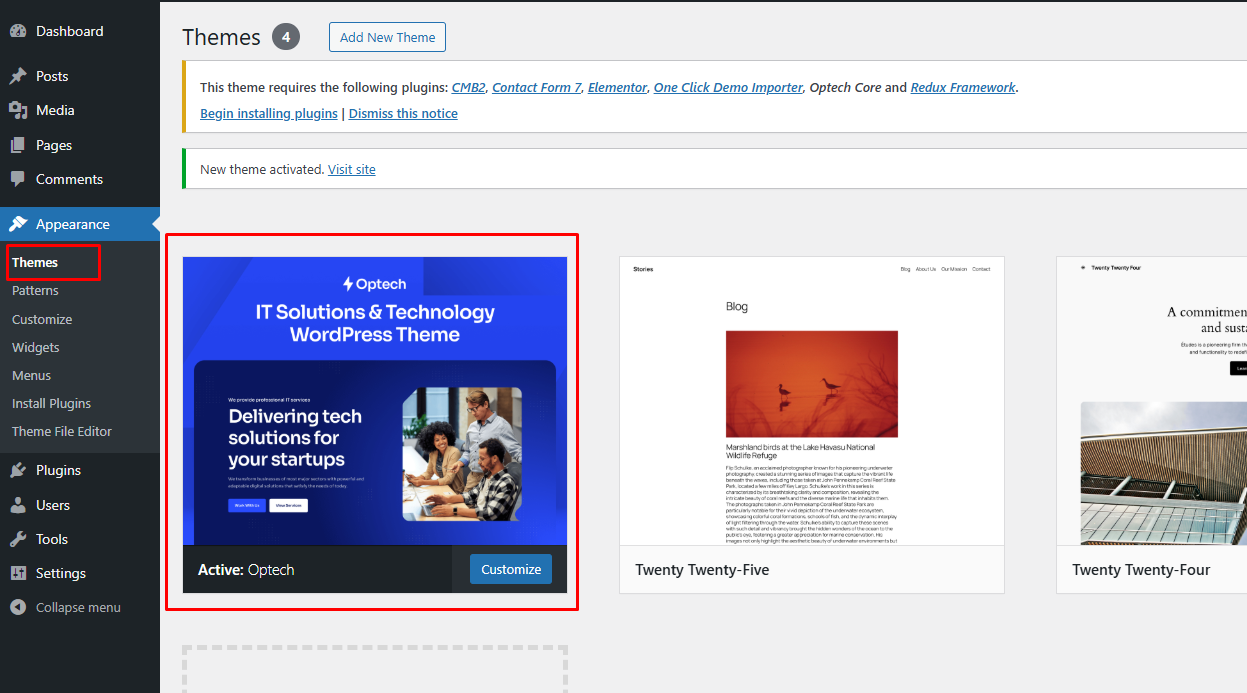 Once uploaded, activate the theme by heading to the “Themes” menu in the WordPress Dashboard. Locate the Optech Theme and hit “Activate”.