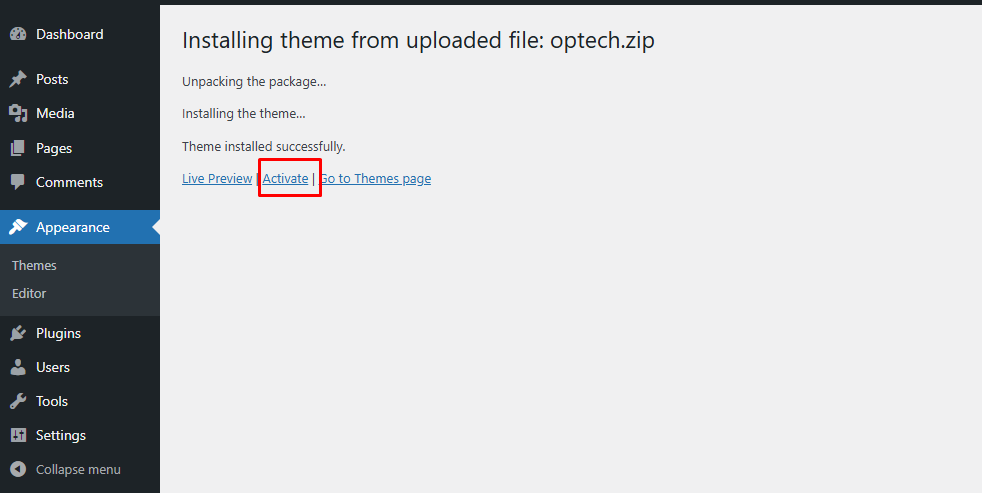 8. When the installation complete, click Activate. You will be redirected to Themes page with Optech activated.