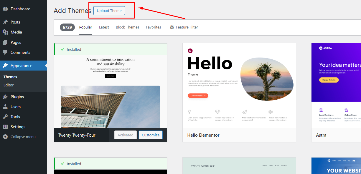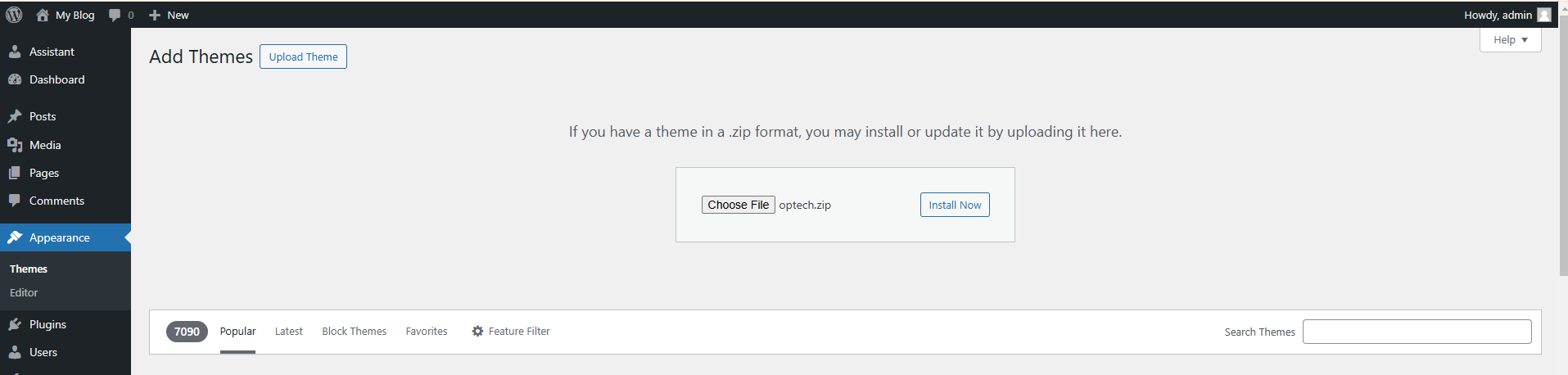 Note: When uploading your theme with the installer, please ensure you are uploading the theme .zip file, not the entire package you downloaded. In this case, you will be uploading optech.zip